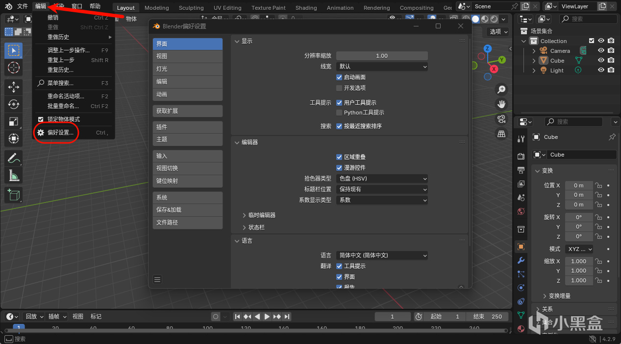 1.  打开blender,找到窗口左上角的**[编辑]-[偏好设置]**并打开