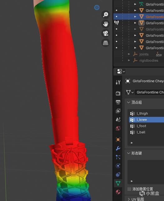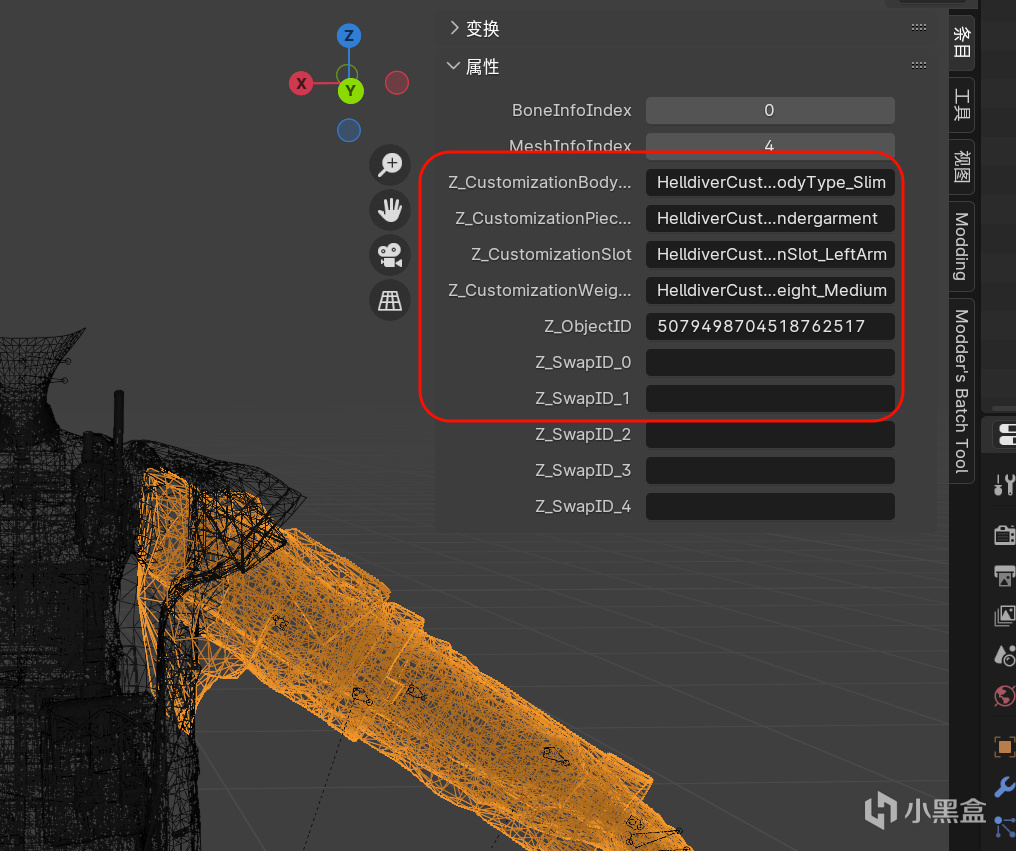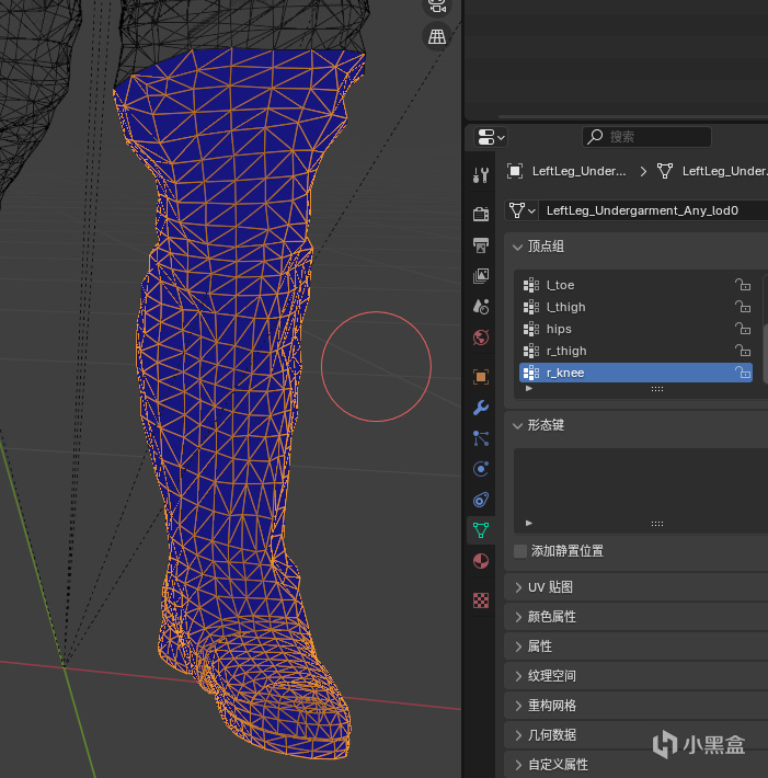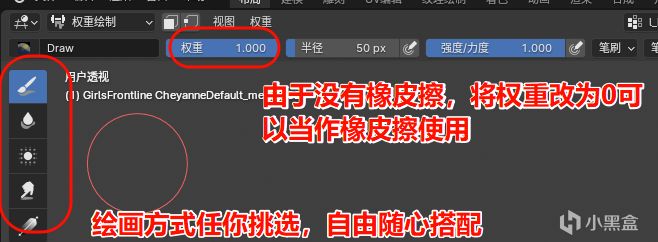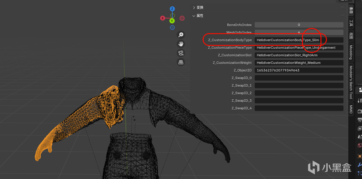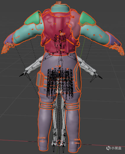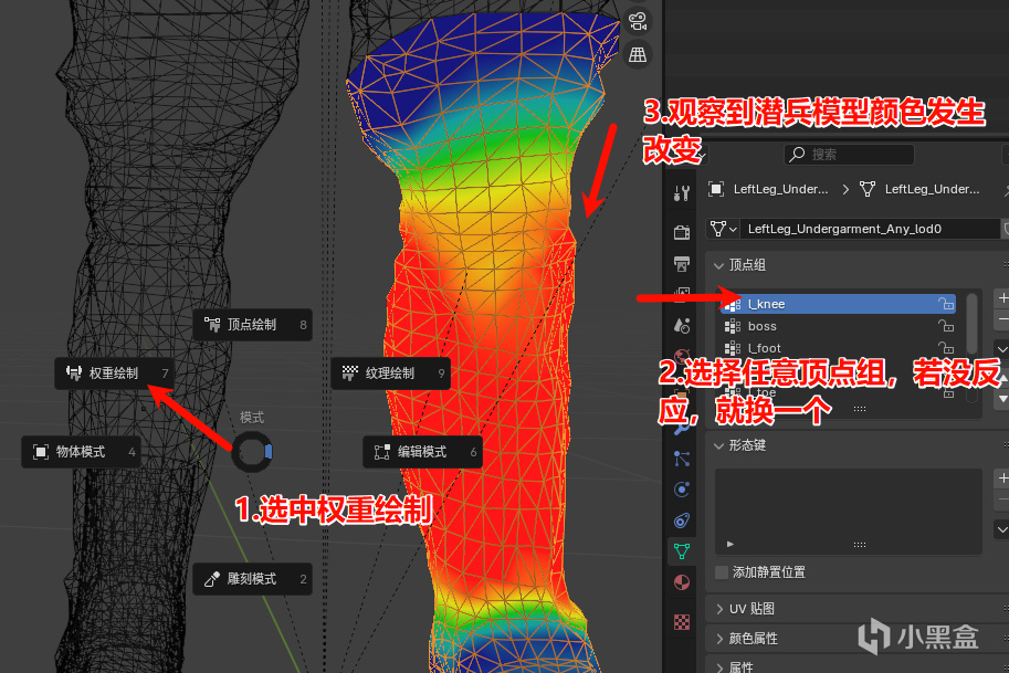 1. 在自己的模型界面,选中与潜兵模型相同的部位,按下**[Ctrl+Tab]切换为[权重绘制],绘制与潜兵一样的权重,多余出来的顶点组直接删除就行,且顶点组的名称必须和潜兵的顶点组名称一致**