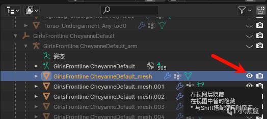 • 其中,头部需要用作头盔,可以先将其隐藏,点击左上角**[视图层]**头部的小眼睛来隐藏