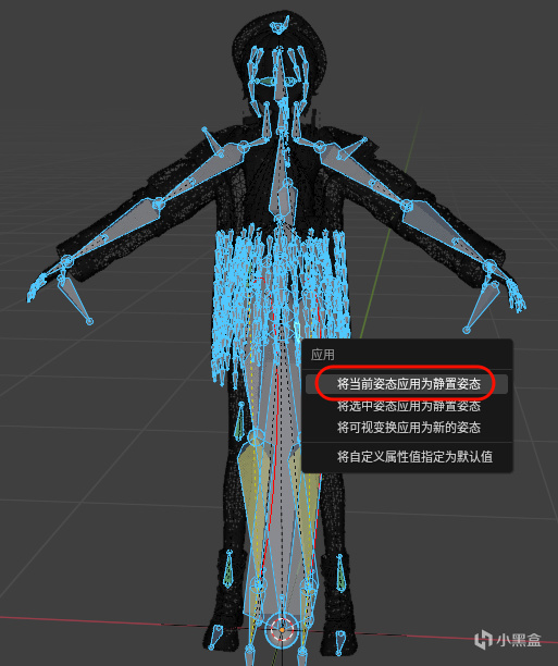 1. 再点击骨架,回到**[姿势模式],按[Ctrl+A]选择[将当前姿势应用为静置姿态]**