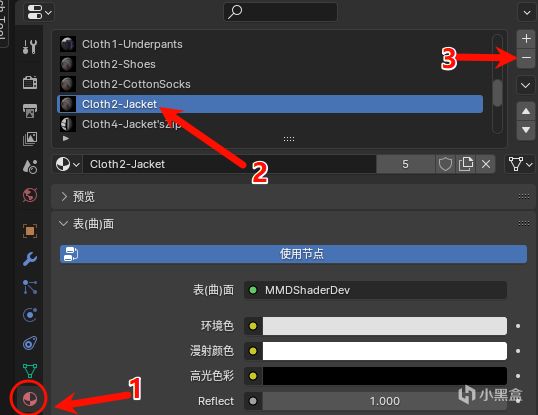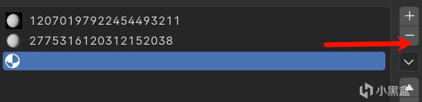 1. 进入**[物体模式],在[材质]页面内,将你的模型材质,置于除了120开头的另一个材质下方,随后点击[-]**删除你的模型材质。