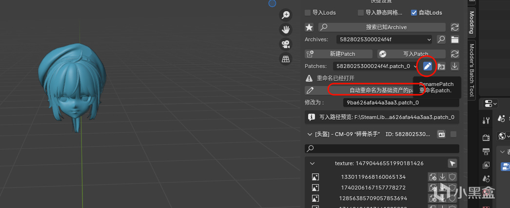 1. 同样的方法,导入模型与写入游戏,值得注意的时,在头盔这里,可以开启自动重命名,这样它就会和盔甲写进同一个文件当中(前提是你的盔甲也开启了自动重命名)