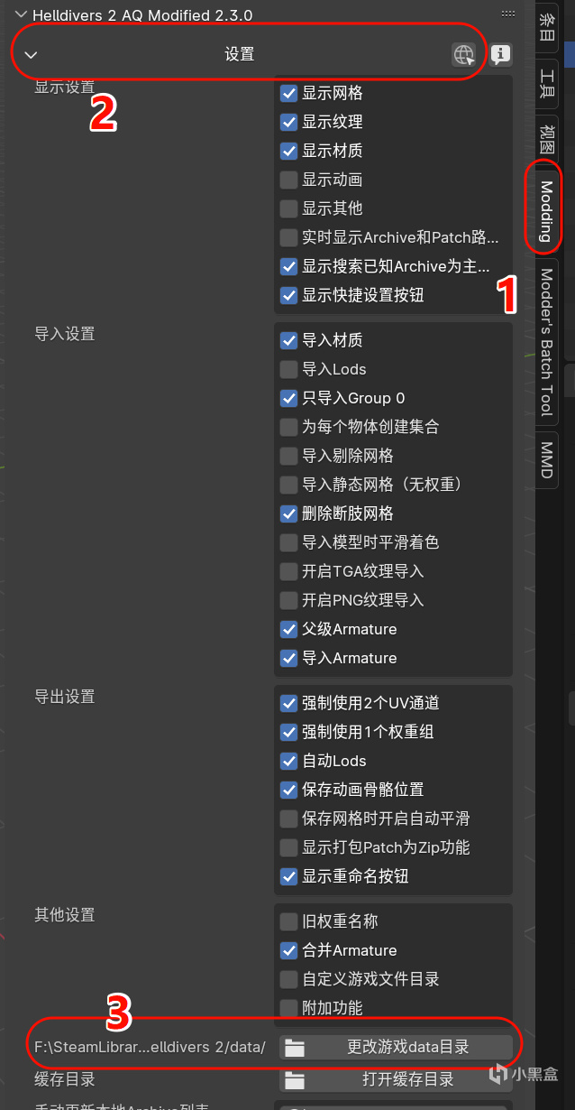1. 在插件菜单中,找到**[Moding]并打开,点击[设置]按钮,在底部选择你的[绝地潜兵游戏路径内的data路径]**,在Steam游戏属性内可以找到游戏路径