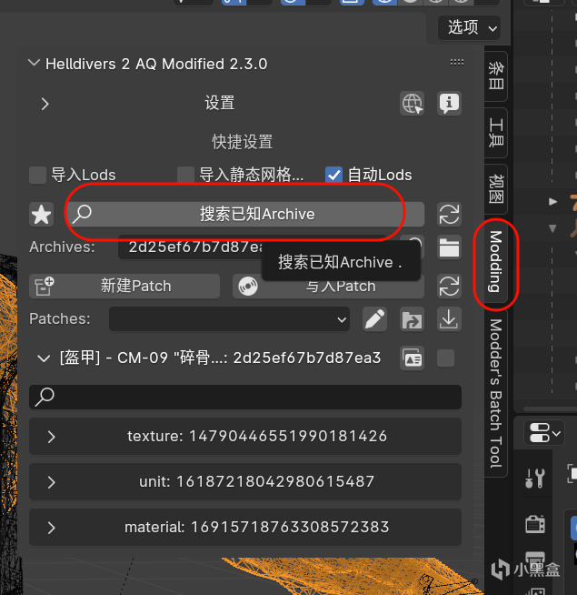 1. 在插件栏,找到**[Moding],点击[Search Found Archives | 搜索已知Archive]**,搜索你所替换的护甲