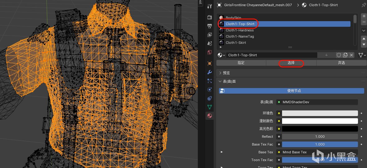 • 如图:我选择了**[Cloth1-Top-Shirt]**,目标部位明显被选中,则当前材质为需要保留的材质