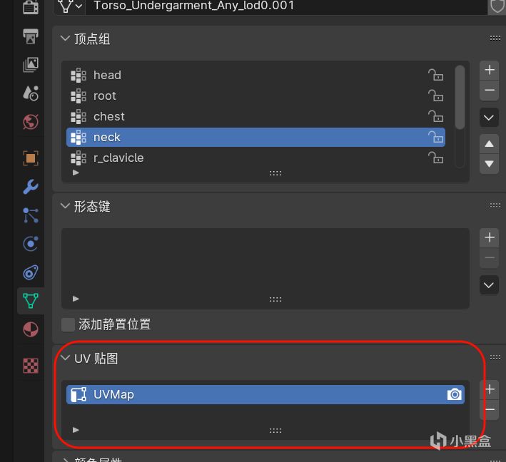 1. 删除多余UV贴图,找到**[数据]-[UV贴图],点击右侧[-]**删除多余贴图